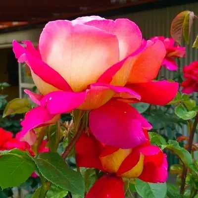 vörös, szalmasárga fonákkal, vágóvirágú, illatos, tömött szirmok, teltvirágú, levelei fényeszöldek