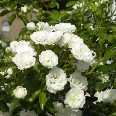 hófehér virágú park vagy ágyásrózsa, csokros virágú, fényeszöld levélzet jellemzi